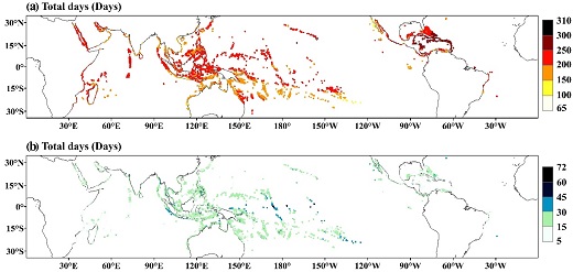 图2 2022-2070年SSP58全球变暖情景下,全球珊瑚礁区域海洋热浪总天数(a)和海洋冷浪总天数(b)空间分布