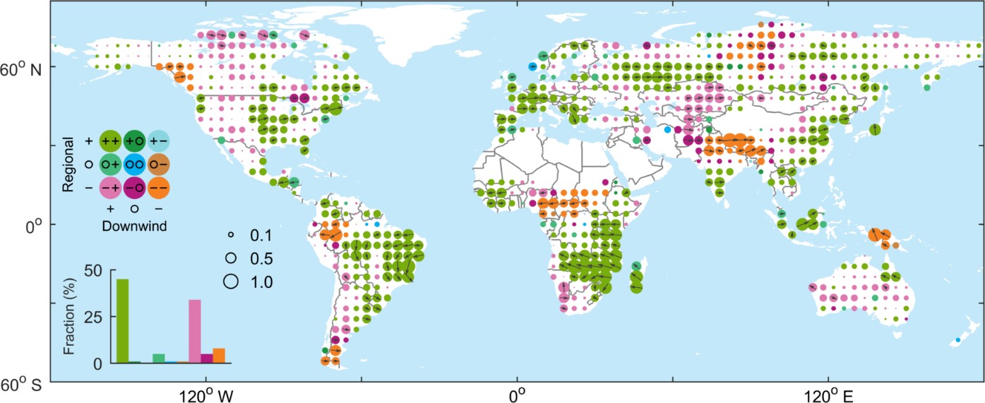 图1. 全球植被的综合水文效应格局图(左侧图例中+表示显著有利,O表示不显著,̶ 表示显著不利;左侧和右侧符号分别表示对当地/区域和下风向地表可用水量的影响)