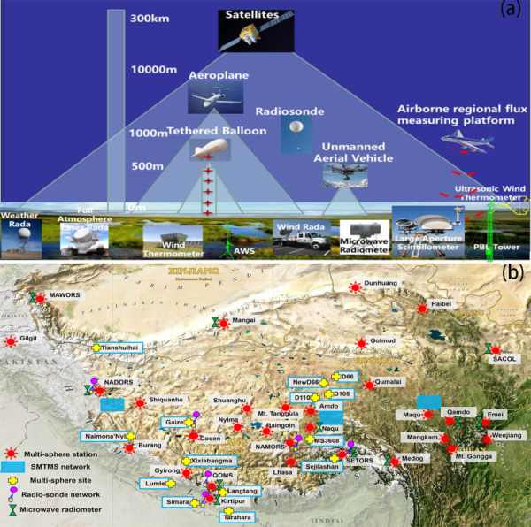图1.青藏高原三维立体综合观测研究平台。(a)青藏高原地气相互作用过程和大气边界层过程监测仪器垂直分布概况;(b)青藏高原地气相互作用过程和大气边界层过程综合观测研究站点分布情况。