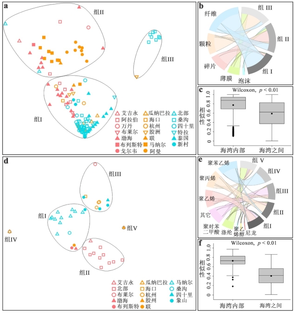 图2.海湾沉积物微塑料形状(a-c)和聚合物(d-f)组成特征及相似性