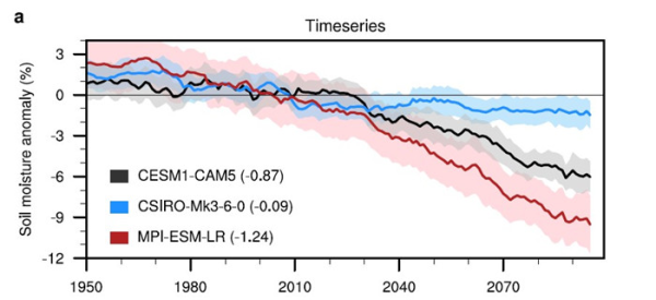 图2.不同模式模拟和预估的4-6月中亚南部土壤湿度变化,所示结果为相对于当前气候态(1995-2014年)异常值(单位:%)