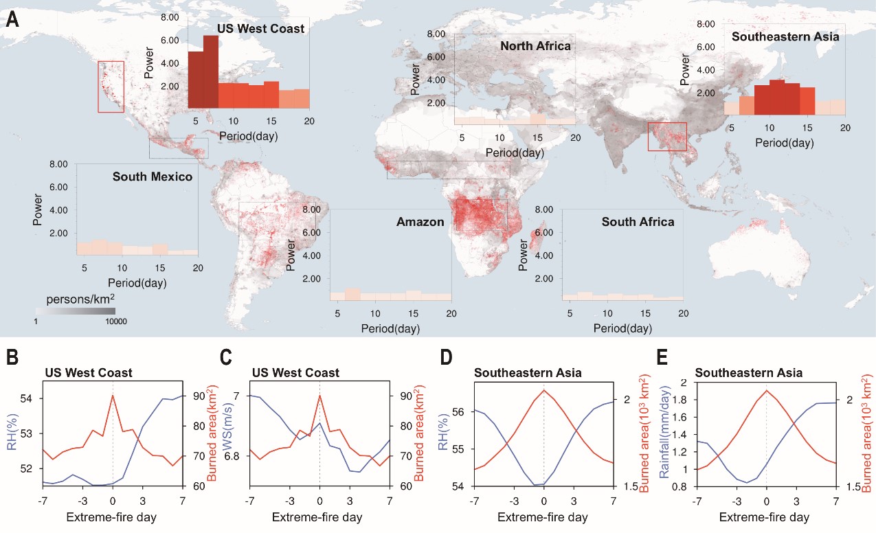 该研究团队通过分析过去20年全球不同野火燃烧区的卫星观测数据,发现美国西岸和东南亚的中南半岛地区的野火燃烧面积存在着显著的天气尺度变化,并分别在1周和2周时间尺度频谱最强,前者受风速和湿度控制,而后者则主要受降雨调制(图1)。团队进一步对2020年9月美国西海岸破纪录超级野火事件和2004年3月中南半岛森林大火开展气象-化学全耦合数值模拟,揭示了两个地区不同的野火天气尺度变率和主控因子背后的机理。研究发现,在美国西部的地中海气候区,野火排放的烟羽可增加气溶胶光学厚度,通过气溶胶-辐射-边界层相互作用增强局地热力环流(更多的干热山风),由此引起野火区风速的增大、湿度的减小和大火潜势的上升,从而显著增强野火气溶胶的排放并导致峡谷城市空气质量的急剧恶化。然而,位于亚洲季风区的中南半岛则有所不同,抬升烟羽的辐射效应在我国南部沿海和南海北部导致气溶胶-边界层-低云-季风的相互作用,显著降低南海向半岛横断山脉东侧的水汽输送,从而减少当地的降水并进一步延长燃烧季节。两大地区的野火天气反馈机制均由吸收性气溶胶(如黑碳等)的辐射效应引发的边界层热力层结和水汽输送的改变所导致,但两地野火天气反馈作用的时空尺度不同。中南半岛地区野火燃烧烟羽可被抬升至高空后沿着我国南部沿海传输上千公里,并伴有复杂的云与降水过程以及大尺度环流的参与,故而该地区野火天气反馈的时间尺度较北美西岸则相对更长。