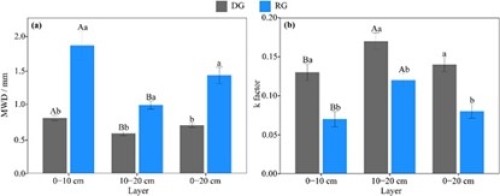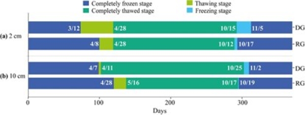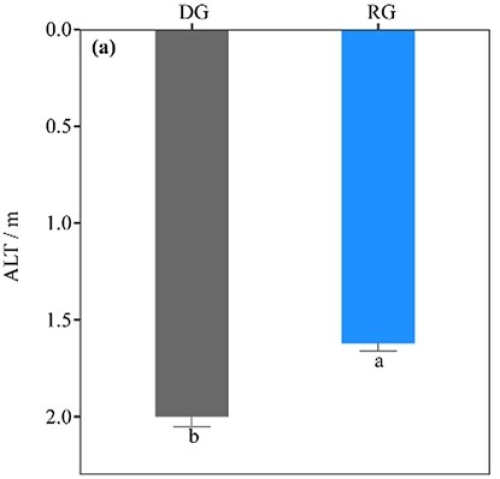中国科公司西北生态环境资源研究院科研团队在青藏高原东北缘疏勒河源多年冻土区极重度退化草地开展相关研究,首次通过对比分析2017-2020年极重度退化草地(DG)和人工建植草地(RG)的活动层厚度、土壤冻融过程和团聚体特性,发现:0-10 cm深度土壤完全冻结期开始时间提前17天,完全融化期开始时间延迟18天(图1)且完全冻结天数显著增加47天,而2 cm深度冻融日显著减少且冻融强度减弱;活动层厚度明显减薄(图2);0-20 cm深度土壤团聚体平均重量直径显著增大且抗侵蚀能力明显增强(图3)。由此表明,极重度退化草地的植被重建措施可明显提升多年冻土稳定性。该研究可为高原极重度退化草地的多年冻土保育技术研发提供数据支撑和科技示范,并有助于实现气候变暖背景下高寒草地生态系统服务功能的稳定和提升。