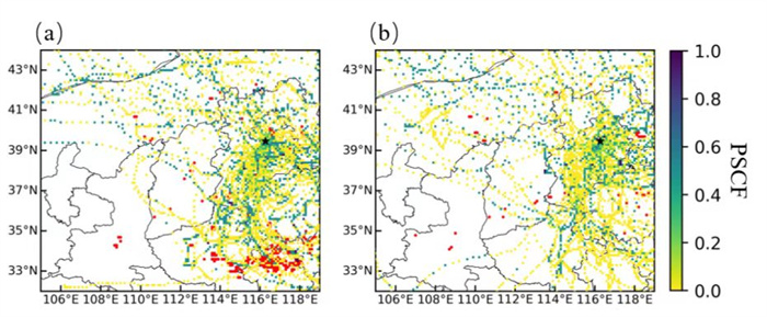 图2. 聚类算法分型节点1(a)和节点7(b)PSCF值及火点密度分布