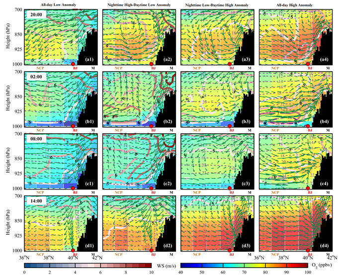 图3. 地面臭氧四种日变化类型下边界层气象与臭氧演化特征