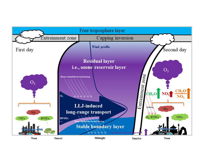 中国科公司大气物理研究所与成都信息工程大学、北京市城市气象研究院合作,分别使用北京长期臭氧探空数据集(2001-2019年)和地面臭氧观测资料(2013-2020年暖季)开展聚类分析,并结合多源数据和方法(常规气象要素,卫星观测,再分析资料,轨迹模拟,PSCF潜在贡献源算法等)探讨北京地区对流层和近地层臭氧分布变化特征及其成因。对流层臭氧垂直特征研究表明,整体来说,由于同时受气象因子和臭氧前体物季节变化(暖季高VOCs、冷季高NOx)影响,北京地区对流层臭氧浓度呈暖季高、冷季低分布特征。聚类算法分类(图1)及其分类节点1、7的PSCF算法(图2)对比显示北京地区春夏季臭氧分布易受南部地区生物质燃烧活动影响,近些年华北平原生物质燃烧控制使得夏季对流层极高臭氧浓度出现频率有所减少。春冬季北京对流层臭氧分布易受平流层入侵和高纬地区臭氧输送影响(分类节点3),使得上对流层臭氧浓度显著升高。针对北京地面臭氧日变化特征开展聚类分析来探讨主要型态、时变特征及其气象和化学影响机制,研究结果表明,北京地面臭氧日变化可分为四种类型:整日偏低型、夜高昼低型、夜低昼高型、整日偏高型。其中,整日偏高型具有更长的时间持续性(平均可达2.3天)。夜间异常的边界层气象条件是推动夜间臭氧浓度偏高的主要推手,其中夜间对流外围的下沉补偿气流导致夜高昼低型的夜间高浓度臭氧,夜间低空急流导致整日偏高型的夜间高浓度臭氧(图3)。整日偏高型期间,大气甲醛柱浓度相较于整日偏低型有显著增长(71%),从而推动臭氧生成敏感性由VOC控制型向过渡型转变,有利于高浓度臭氧的生成。总体而言,整日偏高型的形成有赖于夜间低空急流输送与日间前体物浓度增长两方面条件的共同作用(图4)。