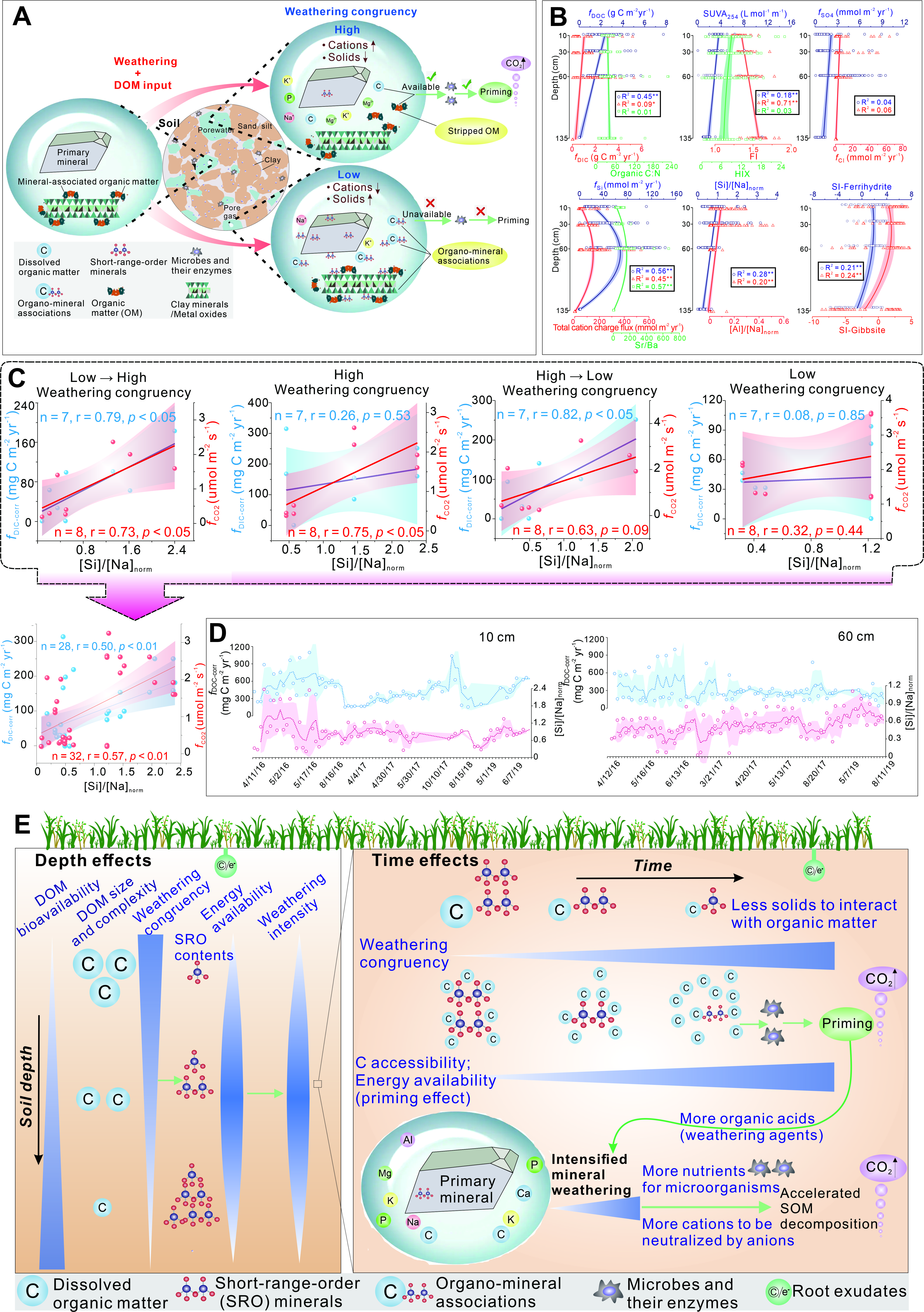 鲁安怀团队与合作者研究发现,地表矿物风化作用与微生物激发效应之间存在着密切联系,矿物风化作用可增强微生物激发效应。按照矿物风化产物的类型,矿物风化一般可分为协调风化与不协调风化两类(图1A)。协调风化产物仅为溶解态离子,可为微生物提供营养元素,促进微生物对有机质的分解。不协调风化产物除产生溶解态离子外,还会产生次生矿物如高岭石、蒙皂石、水铁矿、针铁矿和三水铝石等,这些次生矿物可与土壤有机质结合从而保护有机质免遭微生物的分解。次生矿物还与可溶解性有机质结合,使得可溶解性有机质难以被微生物直接利用,抑制激发效应的发生。这些过程均对碳循环过程产生重要影响 (图1A)。他们进一步深入分析了关键带中不同深度、长时间序列的土壤孔隙水组成和土壤孔隙气体分压等观测数据,获得了矿物风化速率、微生物活动强度及其对有机质矿化程度、可溶解性有机质生物利用性等关键参数。通过大量时间序列分析和统计分析,发现矿物风化作用在时间和空间上均与受激发的微生物对有机碳矿化存在耦合关系(图1B-D)。随着矿物风化作用增强,产生阳离子(营养元素)通量变大,微生物对有机碳矿化的速率也增强,而这些过程常常伴随着微生物活动强度的升高和对溶解性有机质可利用性提高,亦即矿物风化与微生物激发有机质矿化存在耦合作用。研究证实矿物风化的协调性对微生物激发矿化强度有明显的控制作用(图1C)。由于风化强度、风化协调性和溶解性有机质微生物可利用性等,都随土壤深度发生变化,矿物风化调控微生物矿化有机碳的影响也随深度表现出差异(图1E)。