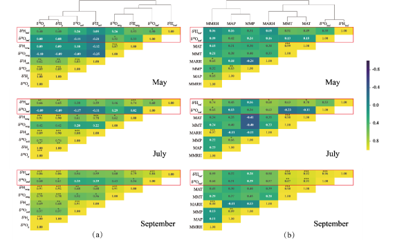 图1.叶片水氢和氧同位素对源水同位素比值和气候因子的响应