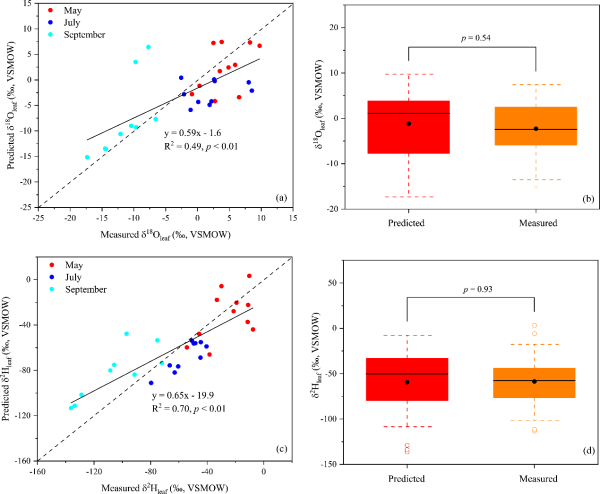 图2.叶片水氢和氧同位素比值测定值和C-G模型预测值对比