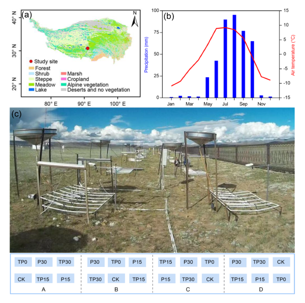 图1.研究站点植被类型(a)、气象条件(b)和实验设计(c)