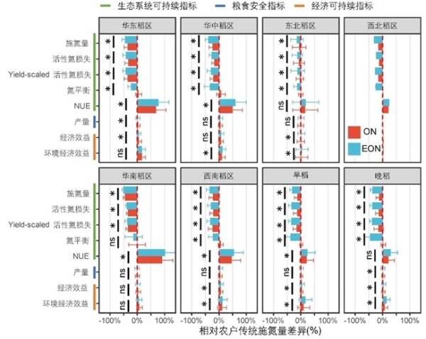图3.主要稻区经济与环境优化氮量(ON和EON)下对生态可持续性、粮食安全和经济可持续性指标的影响