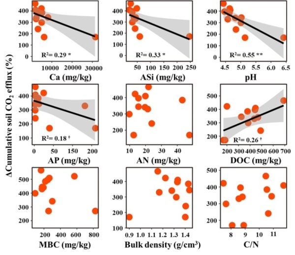 结果表明,在培养期间,添加硅灰石显著增加了土壤CO2排放量,平均增加330.97±29.25%(P<0.05;图1)。本研究中,约90%的土壤CO2排放量变异是由土壤性质变化解释。添加硅灰石增加土壤pH值、溶解有机碳和有效硅是导致土壤CO2排放增加的主要原因(图2)。另外,pH值较低的土壤添加硅灰石后CO2排放量较大(图3)。基于多种土地利用类型,研究表明,硅灰石的应用将导致酸性土壤中的土壤有机碳矿化的显著增加,这或削弱增强岩石风化策略作为CO2封存工具的有效性。