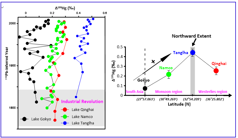 汞是地球上少有的具有显著质量分馏(Hg-MDF,常用δ202Hg(‰)表示)和非质量分馏(Hg-MIF,常用Δ199Hg(‰)表示)的化学元素。汞非质量分馏(Δ199Hg)信号的产生主要与光致还原过程有关。考虑到南亚的人为源汞排放Δ199Hg信号不明显(常接近于0),在印度季风驱动作用之下,大气汞污染物在北向跨境传输过程中受到光致还原作用的时间越长,大气汞Δ199Hg值可能会出现趋正偏的变化趋势。为了验证这一猜测,中科院青藏高原所高寒环境质量与安全团队与合作者利用汞同位素作为示踪工具,发现跨境断面上(Gokyo-纳木错-唐古拉-青海湖)(图1)季风区湖芯中Δ199Hg值呈显著上升趋势,并在唐古拉湖芯中达到峰值;而在位于西风区的青海湖芯中Δ199Hg值出现低于唐古拉湖芯中Δ199Hg值的现象(图2)。通过综合分析上述Δ199Hg的时空变化规律,作者发现,南亚跨境传输汞污染至少自工业革命开始就存在。研究结果还表明,南亚汞污染跨境迁移至青藏高原北界可到达唐古拉山一线(图3)。