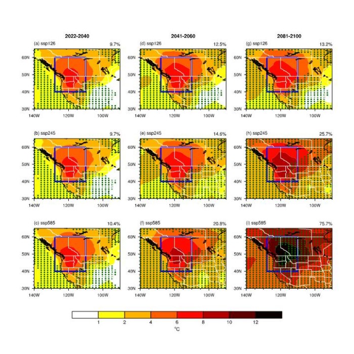 图1. 在SSP1-2.6(a, d, g),SSP2-4.5(b, e, h),和SSP5-8.5(c, f, i)情景下,2-m温度异常(相比于1981-2010年气候平均)在近期2022-2040,中期2041-2060,和长期2081-2100的未来变化。其中,绿点表示在未来时段中打破2021年夏季观测到的高温记录的格点,百分比数表示未来北美西部破纪录的格点比例,蓝色框表示北美西部地区(40°-60°N, 128°-110°W)。