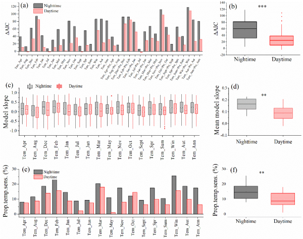 中国科公司武汉植物园助理研究员史航在研究员张全发和党海山的指导下,在全球范围内收集和整理高山林线的更新数据,结合本课题组的野外数据,运用整合分析的方法比较了北半球林线更新对白天和夜间升温的响应,并评估了降雨对林线更新的影响。结果表明,不管处于何种环境条件之下,白天和夜间的升温均能显著促进林线的更新。然而,相比于白天温度,林线更新对夜间温度的变化更为敏感。这一现象主要是由于在全球变暖的背景下,白天温度的升高更易导致干旱情况的发生。因此,鉴于当前全球地表温度将继续上升,需要更多地关注这种白天和夜间变暖对陆地生态系统的不对称影响,以制定有效的策略来应对未来全球气候变化对山地森林生态系统的影响。