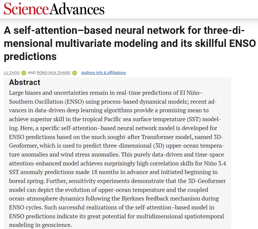 Zhou, L., and R.-H. Zhang, 2023: A self-attention based neural network for three-dimensional multivariate modeling and its skillful ENSO predictions. Science Advances, 9, eadf2827, https://doi.org/10.1126/sciadv.adf2827.