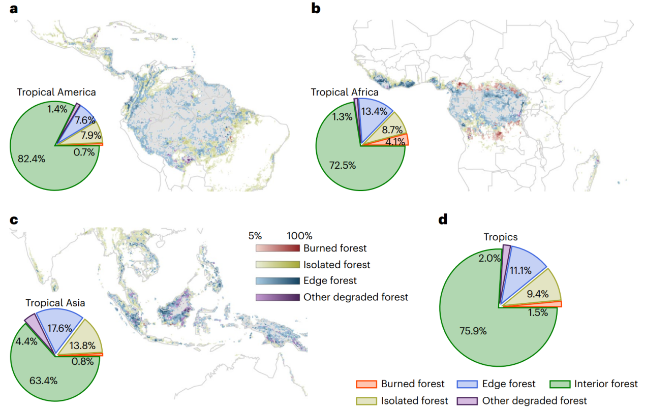 清华大学地学系李伟副教授课题组联合国内外多所研究机构,利用高分辨率卫星观测数据,针对上述问题在热带雨林地区展开研究。研究首先识别了四类退化的热带雨林:被火烧过的森林、小斑块森林、边缘森林和其他退化森林(图1),分析了热带雨林退化导致的生物物理和生物地球化学效应,量化了1990-2010年间人为导致的热带雨林退化的生物物理和生物地球化学效应。研究发现,2010年24.1%的热带雨林发生了退化;发生森林退化区域的地表温度相比于没有发生退化的内部森林高了0.78±0.88°C,对整个热带区域而言,热带雨林退化造成了地表平均升温0.022±0.014°C;热带雨林退化造成的总碳亏缺达到了6.1±2.0PgC,带来的热带区域等效升温为0.026±0.013°C。热带雨林退化导致的生物物理及生物地球化学增温效应十分接近。1990-2010年,人为导致的热带雨林退化带来的白天地表温度升温为0.018±0.008°C,带来的碳亏缺为2.3±0.8PgC,与同期森林砍伐的影响量级相当。