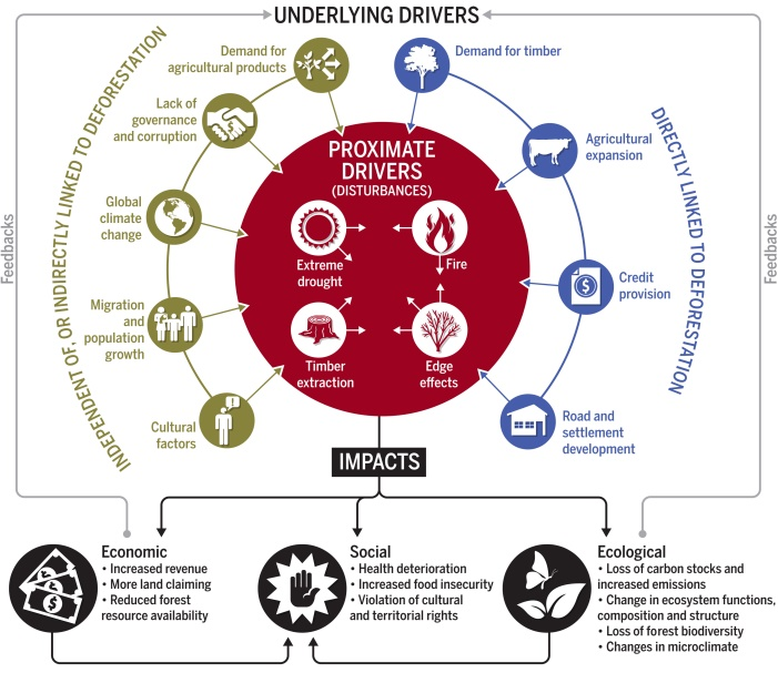 研究认为导致森林退化的四个关键干扰因素为森林火灾、边缘效应(即毗邻已砍伐区域的森林发生的变化)、木材砍伐(如非法砍伐)和极端干旱。不同的森林区域可能会受到其中一个或多个干扰因素的影响。该项研究由35名国际科学家和研究人员主导,是AIMES(地球系统分析、整合和建模)项目的成果。北京师范大学系统科学公司韩战钢教授课题组参与了本项目的研究,为项目提供了系统和整体的研究方法。