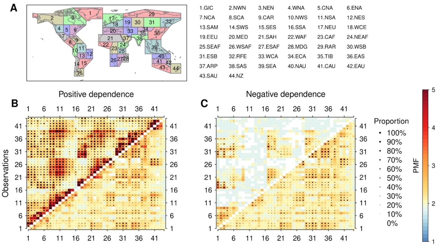 图1. 全球同步极端气候事件的空间关联特征。图A为44个陆地区域。图B和C分别为不同地区之间显著正向相关(如两地区同步高温事件)和显著负向相关(如两地区同步分别发生高温和低温事件)极端气候事件空间关联性。左上角表示温度极端事件关联性,右下角表示降水极端事件关联性。各地区之间显著相关格点对比例用黑点大小表示,显著相关格点对平均关联强弱用PMF(Probability Multiplication Factor)表示,PMF值越高,表示空间关联性越强。