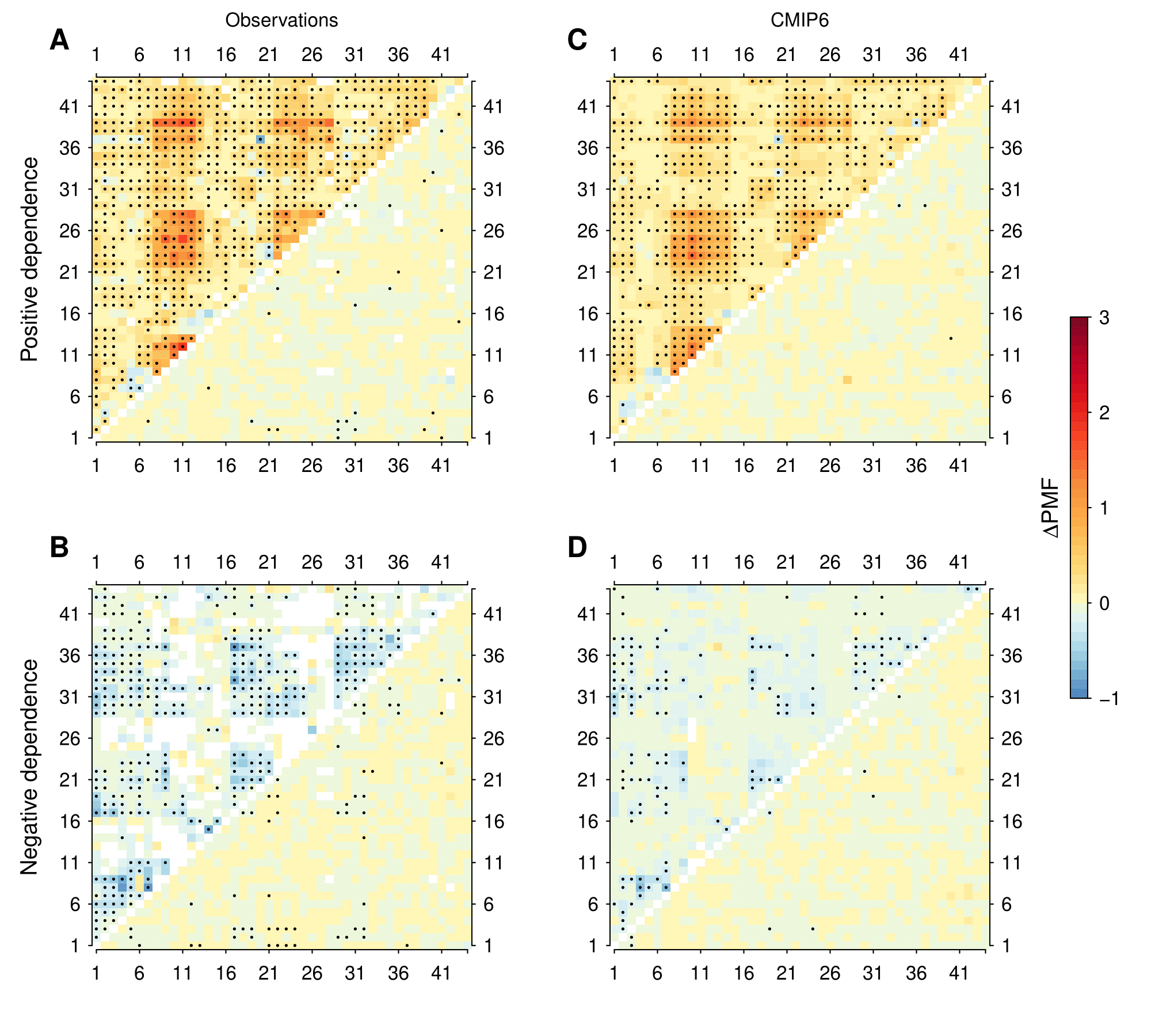 图2. 人为气候变化对全球同步极端气候事件空间关联性的影响。气候变化对陆地44个区域之间同步极端气候事件关联性的影响:黑点表示具有显著影响,影响强弱用PMF差异(ΔPMF)表示,正(负)值表示关联性增强(减弱)。左上角表示同步温度极端事件,右下角表示同步降水极端事件。