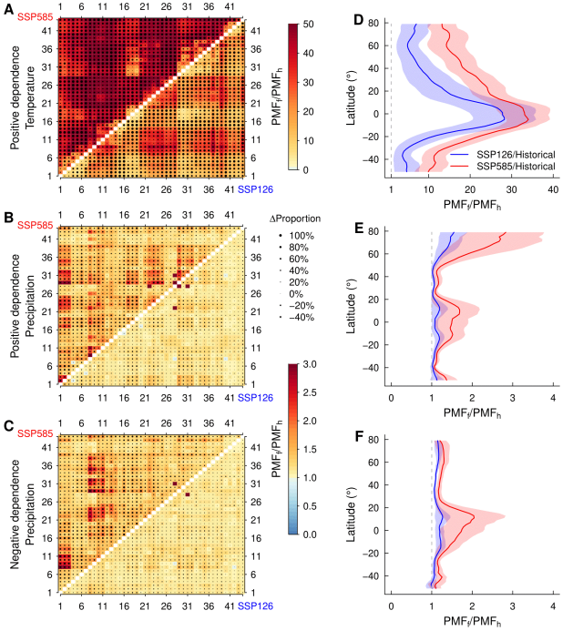 图3. 未来气候变化情景下全球同步极端气候事件变化特征。极端气候事件关联强度变化用未来PMF和历史PMF比值(PMFf/PMFh)表示。