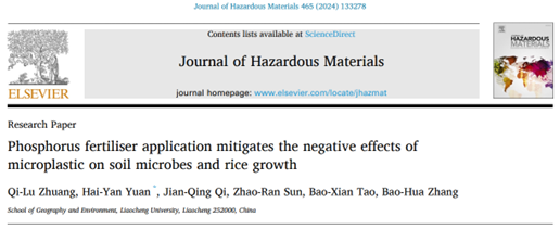 2023年12月19日,哈哈体育袁海燕博士团队在环境科学与生态学领域SCI期刊《危险材料杂志》(Journal of Hazardous Materials)发表了题为《磷肥的施用缓解了微塑料对土壤微生物和水稻生长的负面影响》(Phosphorus fertiliser application mitigates the negative effects of microplastic on soil microbes and rice growth)的研究性论文,揭示了磷肥施加对微塑料污染土壤中微生物和水稻生长状况的影响机制。地理学专业硕士研究生庄启鲁为第一作者,袁海燕博士为通讯作者。《危险材料杂志》(Journal of Hazardous Materials)是中国科公司JCR分区下环境科学与生态学领域的1区TOP期刊,2023年影响因子为13.6。
