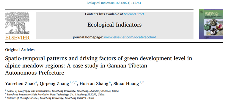 近日,公司哈哈体育张起鹏副教授团队在国际期刊《生态指标》(《Ecological Indicators》)上发表了题为“Spatio-temporal patterns and driving factors of green development level in alpine meadow regions: A case study in Gannan Tibetan Autonomous Prefecture”的研究文章。2019级本科生赵严琛为论文的第一作者,张起鹏副教授为通讯作者,HAHA体育为唯一署名单位。《Ecological Indicators》是JCR分区下的环境科学与生态学领域的SCI二区TOP期刊,影响因子为7。