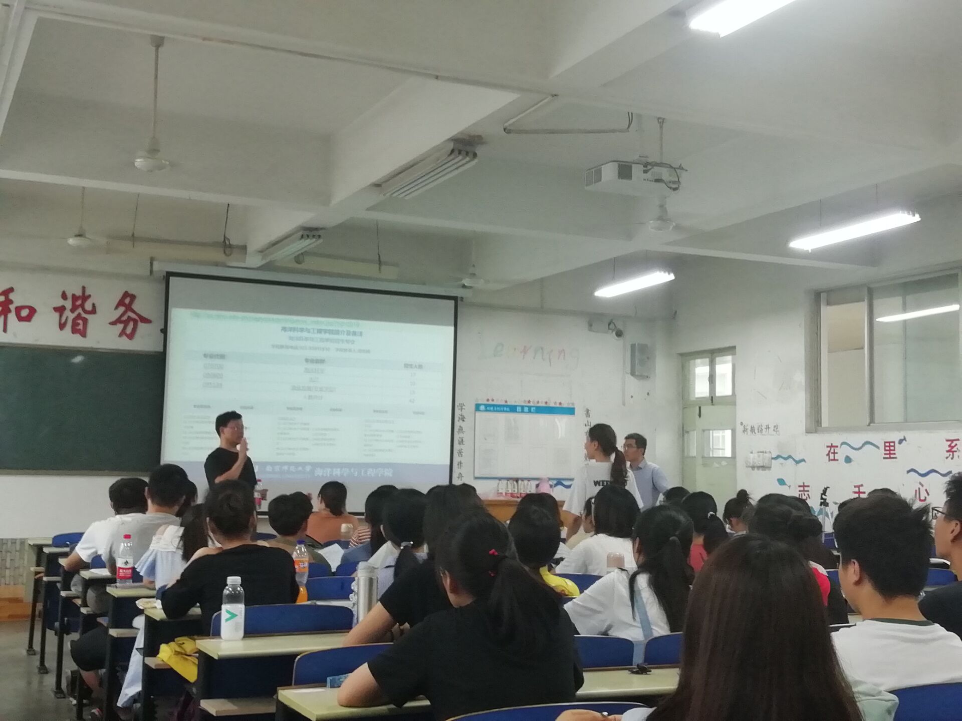 首先,刘杰老师简单做了开场白,为员工们介绍了来自南京师范大学海洋工程与科学公司的江胜尧老师、赵林老师。老师首先为同学们介绍了南京师范大学海洋公司的强厚团队力量,讲述了主要的涉海教师和部分合同制聘用的科研人员。为我们介绍南京师范大学海洋公司现状与发展的同时,也普及了一级功能实验室的构成与目标。南京师范大学海洋公司的教师队伍也是不容忽视的,包括海洋科学学科团队和水产科学团队,并重点展示了徐敏、刘红玉、周卫等海洋科学团队几位老师的风采和尹绍武、任乾、孟庆国等水产科学团队的老师。最后,老师也提到了同学们比较关注的毕业生研究方向问题,其中包括农业全日制硕士专业学位和渔业学位点毕业生去向,并介绍了学位点负责人及博士生导师尹绍武教授。另外,有关研究生国际交流中的走出去,请进来,还设置了“丝绸之路”奖学金项目。